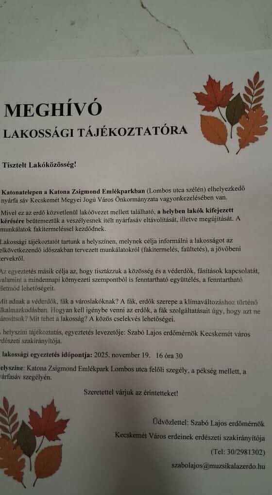 lakossági tájékoztatót tart a Katona Zsigmond Emlékparkban.