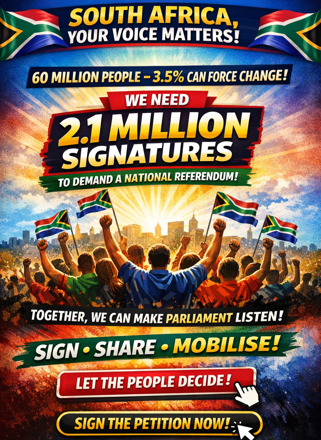 PETITION TO PARLIAMENT OF THE REPUBLIC OF SOUTH AFRICACalling on All Members of Parliament to Support a Motion for a National Referendum on the Mass Deportation of Illegal ForeignersTo:All Members of the National Assembly and the National Council of ProvincesAll Political Parties Represented in ParliamentThe Speaker of the National Assembly and the Chairperson of the NCOPThe President of the Republic of South AfricaWe, the undersigned citizens of the Republic of South Africa, hereby petition Parliament to support and initiate a motion calling for a National Referendum, in terms of Section 84(2)(g) of the Constitution and the Referendums Act, 1983, on the following question:“Should South Africa implement an immediate and coordinated mass deportation of all illegal foreigners residing within the country?”WHY THIS REFERENDUM IS NECESSARY IN MY OPINION.SouthOPINION.My opinion is that South Africans are facing unbearable pressure on jobs, housing, healthcare, education, policing, and social services. Illegal immigration has escalated to a point where it threatens national stability, economic security, and the safety of communities. Despite endless debates, political promises, commissions, and legislation, the crisis continues to grow.Parliament has the constitutional duty to uphold the rule of law, protect national sovereignty, and ensure that South Africa’s borders and immigration systems serve the interests of its citizens.A referendum is a democratic tool available under our law. It gives ordinary citizens—not politicians, not lobbyists, not foreign interests—the power to express a clear mandate on a matter that directly affects their daily lives.The Referendums Act of 1983 (as amended) remains the applicable mechanism for conducting national referendums, and Parliament has the authority to table a motion requesting the President to call such a referendum.